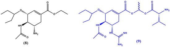 Chemical structures of oseltamivir (8) and its GOC-L-Val prodrug 9.
