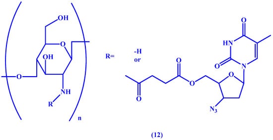 In a study by Liang et al. [49] chitosan (COS), a semi-synthetic polysaccharide formed from alkaline deacetylation of chitin, is used as a macromolecular carrier for AZT. In an effort to control the distribution of the drug and limit its rapid blood elimination, the linker of choice was a biodegradable succinic (suc) ester between AZT and the macromolecule which allows for sustained release of the drug (see 12 in Figure 6). The research team was able to confirm sustained release of the orally administered drug in mice as well as selective renal targeting via fluorescence imaging.