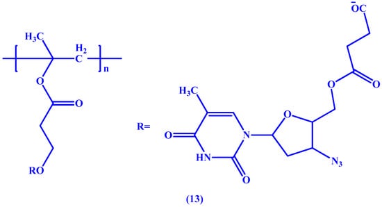 Also employing the succinic ester linkage, Neeraj et al. [50] have conjugated AZT to poly-2-hydroxyethyl methacrylate (HPMA), a fully synthetic macromolecule, to obtain a macromolecular prodrug (13 in Figure 7) with the aim of improving the pharmacokinetic profile of AZT. In vitro studies performed by the team showed that the resulting prodrug managed to increase both the half-life (8 h for the prodrug vs. 1 h for AZT) and bioavailability of AZT (1470 ng h/mL vs. 645 ng h/mL).