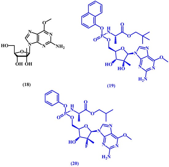 INX-08189, also known as INX-189, is a potent hepatitis C (HCV) virus replication inhibitor prodrug prepared initially from a guanosine derivative (18 in Figure 10). The starting compound undergoes masking and modification of the ester and amino acid moieties, as well as phosphorylation, which allows the drug to become active intracellularly. Afterwards, the prodrug is prepared by masking the phosphoryl group. INX-08189 (19 in Figure 10) was found to be 500 times more potent than the parent nucleoside. Unfortunately, INX-08189 was discontinued in 2012 during phase II development due to its high cardiac toxicity [59,60,61].