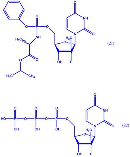 Chemical structure of sofosbuvir (21) and its active form 22.