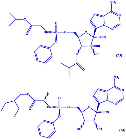 GS-6620 (23 in Figure 12), a C-nucleoside HCV inhibitor, was discovered by Cho et al. [68]. Named C-nucleoside for containing a 2′-C-methyl branched sugar it inhibits NS5B by preventing nucleoside-triphosphates from binding to the active site [69]. While this drug exhibited potency in phase I trials, it is hindered by intra- and inter-patient variability. Very recently, GS-5734 (24 in Figure 12), has been discovered by Siegel et al. [70] for the treatment of Ebola virus (EBOV). The authors report pre-clinical efficacy in nonhuman primate EBOV challenge model (EC50 = 86 nM) with a Phase II study (PREVAIL IV) currently enrolling.
