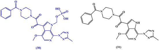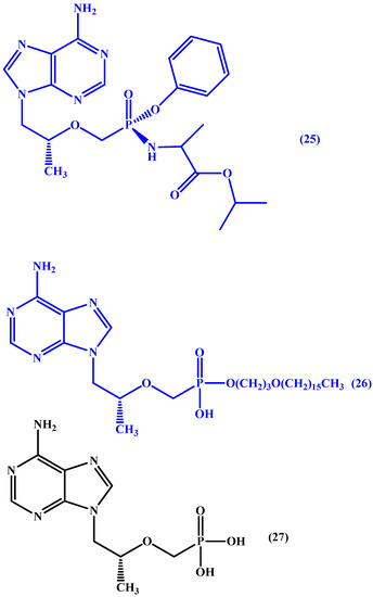 Also, CMX157 (26 in Figure 13) a hexadecyloxypropyl conjugate of the acyclic nucleotide analogue of tenofovir (27 in Figure 13). In phase I trials, the conjugate was found to have HIV hepatic targeting and was 267-fold more active than tenofovir against HIV-1 and 300 fold more active than tenofovir against multiple viruses in several different cell systems. Moreover, it was found to have wide activity against all major subtypes of HIV-1 and HIV-2 in fresh human peripheral blood mononuclear cells. Also, it was associated with higher intracellular levels of tenofovir–diphosphate conjugate than observed with tenofovir. The authors report that the increased antiviral activity can be attributed to increased cellular uptake and conversion to active diphosphate intracellularly. Moreover, a noticeable increase in CMX157’s selectivity index was reported due to decreased EC50 values in MT-2 cells and peripheral blood mononuclear cells (PMBCs) [61,76].