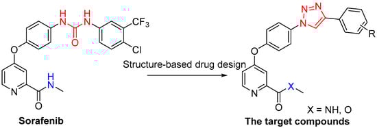 Although significant progress has been achieved in the treatment of tumors, it is still a major health concern worldwide. Sorafenib is a well-known antitumor agent, which potently targets several kinases such as vascular endothelial growth factor receptor (VEGFR), platelet-derived growth factor receptor (PDGFR), stem cell factor receptor (c-Kit), and the downstream protein Raf [1]. It demonstrates excellent activity against a broad range of tumor types including renal, hepatocellular, and colorectal carcinomas [2,3,4]. However, the relative bioavailability of sorafenib is merely 38−49%, mainly due to its poor water solubility [5,6]. Thus, a feasible strategy for identifying antitumor agents could be the modification of sorafenib, paying equal attention to the potency and hydrophilicity of the derivatives.