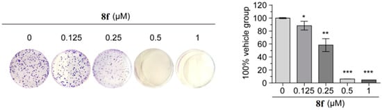 Representative images of colony formation of HT-29 cells treated with 8f. Relative colony formation rate is shown as mean ± SEM. * p < 0.05, ** p < 0.01, and *** p < 0.001 versus vehicle group; p-values were calculated using an unpaired two-tailed Student’s t-test.