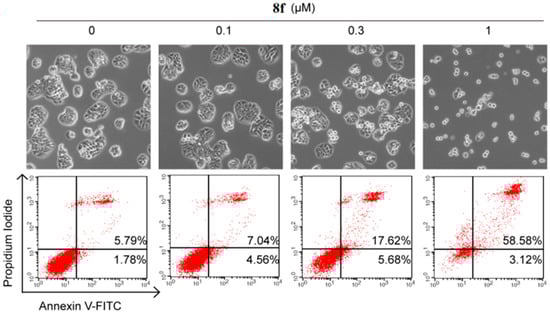 Apoptosis of HT-29 cells was detected using a flow cytometric assay. Briefly, cells were seeded in 6-well plates and incubated overnight. The following day, cells were treated with different concentrations of compound 8f for 72 h. The cells and supernatants were harvested and washed twice with cold PBS and then resuspended in 100μL 1× Binding Buffer. 5 µL of FITC Annexin V and 5 µL PI were added in each tube and the cells were then gently vortexed incubated for 15 min at RT (25 °C) in the dark. In addition, 400 µL of 1× Binding Buffer was then added to each tube. The stained cells were analyzed by a flow cytometer (Thermo Fisher Scientific, San Jose, CA, USA).