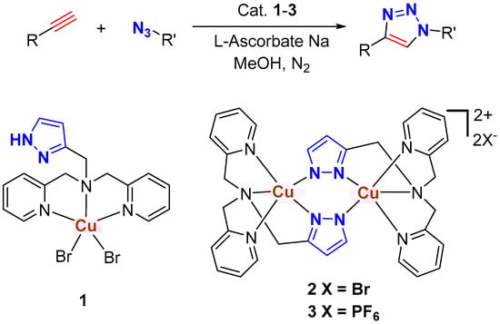 The constructing of 1,2,3-triazole cycles has been intensively studied in recent years. The Cu(I)-catalyzed Huisgen 1,3-dipolar cycloaddition reaction between alkynes and azides (CuAAC) is known as one of the most efficient methods [15,16]. Numerous efficient catalytic systems have been developed for accelerating the catalytic process and decreasing the amount of metal catalyst needed over the past decade [17,18,19]. Very recently, we explored Cu complexes 1–3 bearing an unsymmetrical bipyridine-pyrazole-amine ligand and demonstrated their applications in the CuAAC reaction (Scheme 1) [20,21]. To the best of our knowledge, the binuclear complex 2 is currently one of the most active catalyst systems used in the CuAAC reaction.