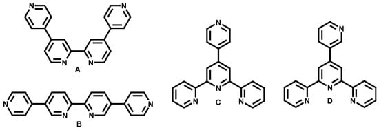 2,2-Bipyridine (bipy) and 2,2′:6′,2″-terpyridine (terpy) chelators conjugated to pyridyl units, 4,4′:2′,2″:4″,4″′-quaterpyridine (A), 4,5′:2′,2″:5″,4″′-quaterpyridine (B), 4′-(4-pyridinyl)-2,2′:6′,2″-terpyridine (C) and 4′-(3-pyridinyl)-2,2′:6′,2″-terpyridine (D).
