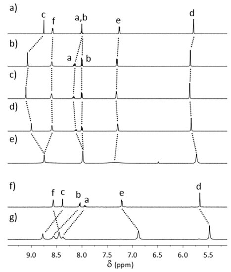 Partial stacked 1H-NMR spectra (500 MHz, d6-DMSO, 298 K) of (a) L; (b) [Ag(L)]NO3; (c) [Ag(L)]BF4; (d) [Ag(L)]SbF6 and (e) [Fe(L)2](BF4)2 and (500 MHz, d3-acetonitrile, 298 K) (f) L and (g) [Fe(L)2](BF4)2.