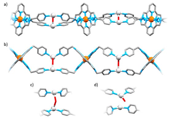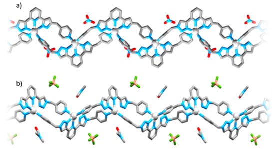 X-ray diffraction quality crystals of the heterometallic [FeAg2(L)2](BF4)4·4H2O complex were obtained via slow diffusion of carefully layered solutions of [Fe(L)2](BF4)2 complex in acetonitrile and AgBF4 in tetrahydrofuran (THF). Small orange crystals in the orthorhombic Cmca space group were obtained. While the structure displayed some disorder in the silver(I) and pyridyl fragments, it clearly showed that the heterometallic architecture had assembed (Figure 7, Supplementary Materials, Figure S17). The structure contained the expected [Fe(L)2]2+ cations coordinated to Ag(I) ions through the peripheral pyridyl units. The Fe-N bond lengths (1.93–1.95 Å) of the [Fe(L)2]2+ cations were similar to those observed in the monomeric [Fe(L)2](BF4)2 complex.