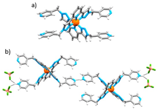 X-ray diffraction quality crystals of the [Fe(L)2](BF4)2 complex were obtained by the slow diffusion of carefully layered nitromethane solutions of the ligand (L) and [Fe(OH2)6](BF4)2. The iron(II) complex crystallized in the triclinic space group P, and displayed the expected [Fe(L)2]2+ cation with an octahedral iron(II) center coordinated to the tripy tridentate pockets of two L ligands (Figure 6, Supplementary Materials, Figure S16). The Fe-N bond lengths (1.924–1.969 Å) were similar to those observed for related iron(II)-tripy [38] and pytri [39] complexes and consistent with the expected diamagnetic low spin state. The pyridyl units of the ligand adopt an anti conformation and interestingly two of the pyridyl units are protonated (Figure 6). One of the protonated pyridyl units engages in hydrogen bonding interactions with two of the BF4− anions (N1---F3 2.81(1), H1A---F3 2.041, N1---F6 2.894(9), H1A---F6 2.254 Å). Two of the [Fe(L)2]2+ cations dimerize around another proton (N18---N18′ 2.629(5), H18A---N18 1.751) (Figure 6b).