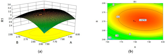 Using software (Design-Expert 8.0.6) to analyze the regression equation, the response surface plot and contour plot obtained with Equation (1) were produced and are shown in Figure 1.