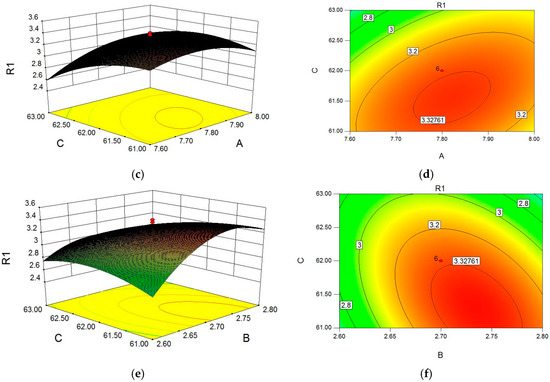 Response surface plot and contour plot showing interaction effects of A (pH value) and B (cellulase) (a,b), A (pH value) and C (ratio of water to material) (c,d), B (cellulase) and C (ratio of water to material (e,f) on the polysaccharide yield.