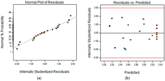(a) Normal probability of internally studentized residuals; (b) Plot of internally studentized residuals vs. predicted response.