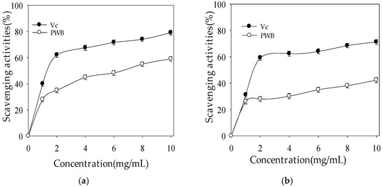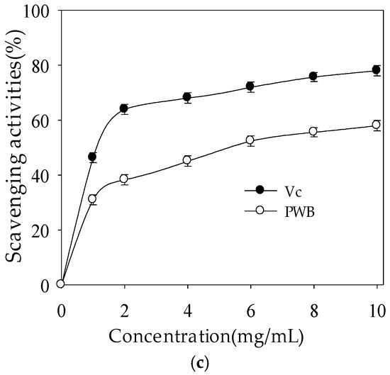 Hydroxyl radicals have been identified as strong oxidants that can produce severe damage to the biomolecules [18], so it is necessary to scavenge or decrease the concentration of hydroxyl radicals. The scavenging hydroxyl radical activities of PWBs and ascorbic acid (VC) are shown in Figure 3a. It is clear that the PWBs and VC both had the ability to scavenge hydroxyl radicals. As shown in Figure 3a, the scavenging ability varied in a concentration-dependent manner, which grew with the increase in the concentration of PWBs and VC. The scavenging activity against hydroxyl radicals showed rapid growth at the low concentration of 2 mg·mL−1, which was 35% and 62.05% for PWBs and ascorbic acid, respectively. The scavenging activity of PWBs was lower than that of Vc within the tested concentration range. When the PWB concentration increased to 10 mg·mL−1, the scavenging activity reached 59%, which was equal to the 79.12% of VC (used as standard) scavenging activity at same concentration. These results suggested that PWBs had significant scavenging ability with respect to hydroxyl radicals. The mechanism of the hydroxyl radical-scavenging activity of PWBs might be that the existence of numerous hydrogen donors in the polyhydroxy structures of PWBs, which have a strong affinity for hydroxyl radicals, can quickly capture hydrogen atoms in C-H chains and produce water. The carbon atom decomposes into harmless products after a range of reactions, resulting in the termination of free radical chain reactions [19].
