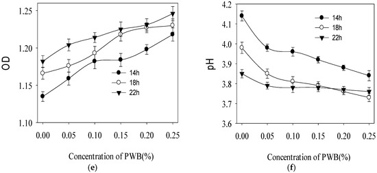 Effects of PWBs on the growth of Lactobacillus acidophilus LA5 (a,b), Bifidobacterium bifidum BB01 (c,d), and Lactobacillus bulgaricus LB6 (e,f). All values are represented as mean ± standard deviation (n = 3).