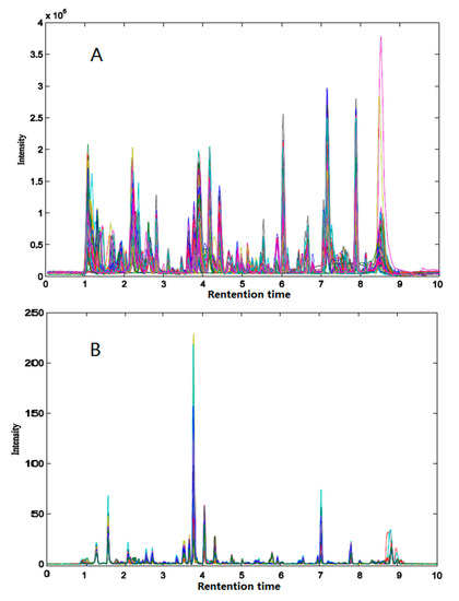 Overlapped total ion chromatograms (A) and liquid chromatograms (B) of paired samples after baseline correction and alignment by ChromP. The chromatograms of different paired samples show different colors in the diagram.