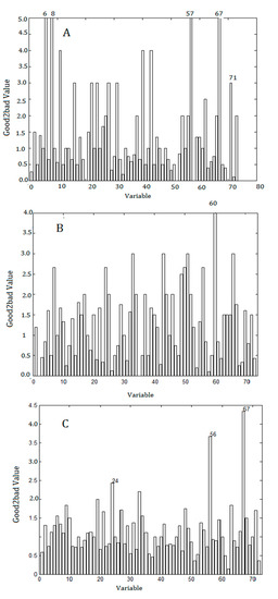 Thus, as shown in Figure S4D, compounds with larger Good2bad values, such as variables 1, 2, 4 and 5, would be classified as relevant variables; on the other hand, variable 3, with a much smaller Good2bad value, indicates an irrelevant variable [42].