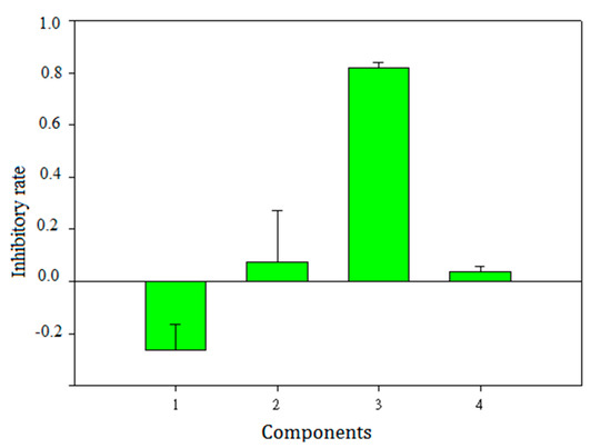 Inhibitory rates of different components 1, 2, 3 and 4 to RAW264.7 growth. Components 1, 2, 3 and 4 were obtained by separating the extract of Herba epimedii on a HPD resin column eluting with 10%, 50%, 80% and 100% ethanol, respectively.
