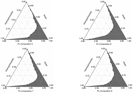 Pseudoternary phase diagrams of compositions 1–8. (Shaded areas represented nanoemulsions).
