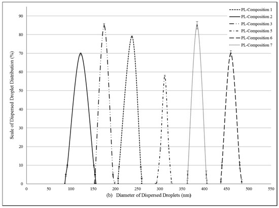 (a) Evaluated droplet size of self-nano-emulsifying drug delivery systems (SNEDDS) in water via dynamic light scattering (DLS) measurement. Evaluated average droplet sizes: composition 1: 233.62 ± 2.34 nm, composition 2: 141.51 ± 1.25 nm, composition 3: 166.44 ± 1.05 nm, composition 5: 374.89 ± 0.23 nm, composition 6: 330.28 ± 0.95 nm, composition 7: 251.81 ± 1.95 nm. Values are expressed as means ± SD, n = 5; (b) Evaluated droplet size of self-nano-emulsifying drug delivery systems (SNEDDS) in water via dynamic light scattering (DLS) measurement. Evaluated average droplet sizes: PL-composition 1: 245.32 ± 0.64 nm, PL-composition 2: 121.75 ± 1.00 nm, PL-composition 3: 174.50 ± 1.00 nm, PL-composition 5: 313.02 ± 3.12 nm, PL-composition 6: 459.50 ± 3.85 nm, PL-composition 7: 383.20 ± 2.55 nm. Values are expressed as means ± SD, n = 5.
