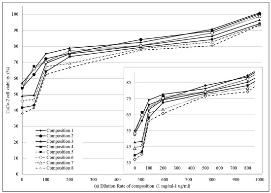 MTT cell viability assay was performed on Caco-2 cells. (Figure 3a,b) Compositions 1–8 were diluted by Hank’s balanced solution (HBSS). 1 mg PL-SNEDDS composition was diluted by 1–1000 mL HBSS. There was a linear relationship between the cytotoxicity and the ratio of dilution of different SNEDDS compositions. The more concentrated samples decreased the cell viability and resulted in significant cytotoxicity. The higher the ratio of dilution of SNEDDS compositions, the better the cell viability of the Caco-2 cell line was. Application of those compositions (compositions 1, 2 and 5, 6), in which the content of Transcutol HP was lower, resulted in higher cell viability values than in the cases of compositions 3, 4 and 7, 8, where the range of Transcutol content was 60–80%. Nevertheless, it can be observed that there is a reduced cytotoxicity at a dilution of 200–1000. Significant differences between groups for compositions 1, 2, 5, 6 and groups for compositions 3, 4, 7, 8 (with the exception of composition 3 vs. compositions 5 and 6 at 100 dilution ratio, where the differences did not reach level of statistical significance). There are significant differences between PL-Composition-treated groups and positive or negative controls. After regression analysis, it seems that there are significant differences between groups for compositions 1, 2, 5, 6 and groups for compositions 3, 4, 7, 8 (Table 3).