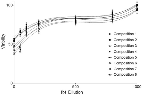 (a) Cell viability evaluation following MTT assay on Caco-2 cells treated with compositions 1–8 in the function of dilution ratio. 1 mg PL-SNEDDS composition was diluted by 1–1000 mL HBSS. Each data point represents the mean ± S.D., n = 10. Significant differences between groups for compositions 1, 2, 5, 6 and groups for compositions 3, 4, 7, 8 are marked with an asterisk (with the exception of composition 3 vs. compositions 5 and 6 at 100 dilution ratio, where the differences did not reach level of statistical significance). Positive control was Triton-X-treated group, negative control was Hank’s balanced solution (HBSS)-treated group; (b) Cell viability evaluation following MTT assay on Caco-2 cells treated with compositions 1–8 in the function of dilution ratio. 1 mg PL-SNEDDS composition was diluted by 1–1000 mL HBSS. Each data point represents the mean ± S.D., n = 10. Significant differences between groups for compositions 1, 2, 5, 6 and groups for compositions 3, 4, 7, 8 are marked with an asterisk (with the exception of composition 3 vs. compositions 5 and 6 at 100 dilution ratio, where the differences did not reach level of statistical significance). Positive control was Triton-X-treated group, negative control was Hank’s balanced solution (HBSS)-treated group. Linear regression of cell viability curves presented in the Figure 3a (regression parameters and goodness of fit data shown in Table 3).