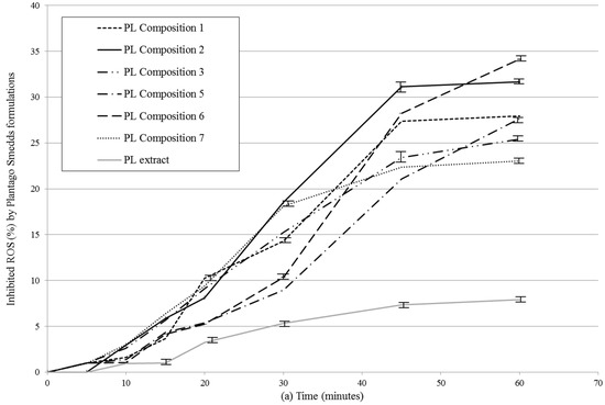 It has been demonstrated that all compositions were able to significantly inhibit DPPH mean oxidation. From PL-compositions, PL-composition 6 showed the most effective antioxidant activity in the DPPH assay. According to our measurements, PL-composition 7 showed the smallest activity, although its antioxidant capacity was found to be significantly higher than non-formulated P. lanceolata extract (PL-E).