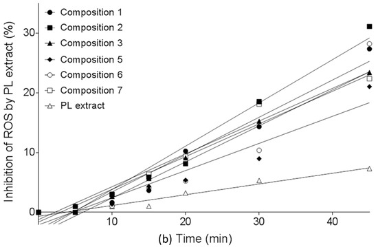 (a) In vitro dissolution study of PL-SNEDDS compositions based on the determination of DPPH (2,2-diphenyl-1-picrylhydrazyl) radical scavenging activity. Values are expressed as means ± SD, n = 5. Negative control was Plantago lanceolata extract without SNEDDS. All PL-composition-treated groups differed significantly from the negative control group (no mark is shown); (b) In vitro dissolution study of PL-SNEDDS compositions based on the determination of DPPH (2,2-diphenyl-1-picrylhydrazyl) radical scavenging activity. Values are expressed as means ± SD, n = 5. Negative control was Plantago lanceolata extract without SNEDDS. All PL-composition-treated groups differed significantly from the negative control group (no mark is shown). Linear regression of inhibition curves presented in Figure 4a. A (regression parameters and goodness of fit data shown in Table 5). As reactive oxidative species (ROS) inhibition data belonging to 60 min obviously deviate from linearity (to the same direction), they were omitted from this analysis.