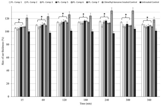 Every orally-administered composition containing 10 mg/mL P. lanceolata extract significantly decreased ear thickness in the complete time period compared to positive control (dimethyl-benzene only), as seen in Figure 6. The maximum effect of dimethyl-benzene was measured at 2 h post-challenge time in either case. For the complete examination period, all compositions decrease ear edema as compared to the positive (untreated) control.