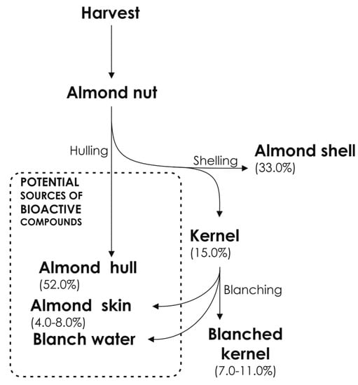 - Hughey, C.A.; Janusziewicz, R.; Minardi, C.S.; Phung, J.; Huffman, B.A.; Reyes, L.; Wilcox, B.E.; Prakash, A. Distribution of almond polyphenols in blanch water and skins as a function of blanching time and temperature. Food Chem. 2012, 131, 1165–1173. [Google Scholar] [CrossRef]