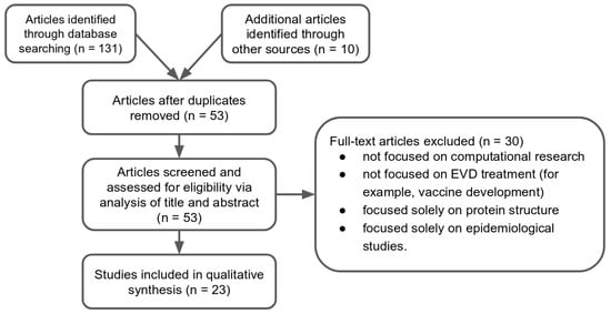 The resources mentioned above were searched for articles relevant to this systematic review including but not limited to the following terms: “computational”, “drug”, “drug development”, “drug discovery”, “drug repurposing”, “in silico”, and “in virtuale”. All searches included the term “ebola” (i.e., logical AND operation).