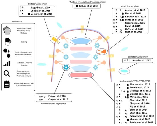 The salient points of all studies are included in Supplementary Table S1. A multitude of methods, software, compounds, biologics, and protein structures (modeled or solved) have been used to computationally predict therapeutics for the treatment of EVD. The studies mentioned here are of highly variable quality and scientific merit. Several are not reproducible given the limited presentation of details, an issue that hinders the efficient and reliable use of results from scientific studies and its translation. This is particularly critical for EVD due to the speed at which the outbreaks happen and the lack of any treatment []. As an example, Brown et al. [] report excellent experiments and results, including computational experimentation, structural contributions to the Protein Data Bank (PDB) [] and subsequent validation attempts with non-computational techniques at discovering inhibitors of VP35. Their top inhibitors, however, are reported in the PDB under the ligand section of the submission information and in the publication under names that are difficult to search for, which makes it difficult to recapitulate or expand on the results in the context of EVD drug repositioning. Ideally, all the studies reviewed here would clearly identify and fully report their results (such as compound names and characteristics) in their publications.