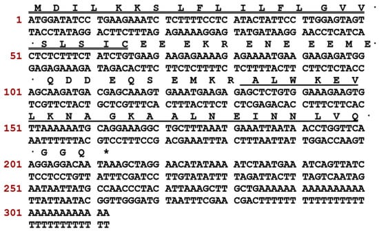 Nucleotide and translated open-reading frame amino acid sequences of Dermaseptin-PH from the skin secretion of Pithecopus hypochondrialis. The putative signal peptide is double-underlined, the mature peptide is single-underlined, and the stop codon is marked by an asterisk.