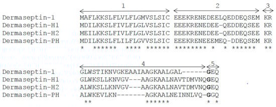Alignments of the amino acid sequences of the prepropeptides of Dermaseptin-1, Dermaseptin-H1, Dermaseptin-H2, and Dermaseptin-PH comprise five domains, 1: putative N-terminal signal peptide region; 2: acidic amino acid rich spacer peptide region; 3: endoproteolytic cleavage point; 4: mature peptide progenitor region; 5: extension of biosynthetic precursor. Amino acid indicated with bold type serves as an amide donor for C-terminal amidation. The identical amino acid residues are indicated by the asterisks.