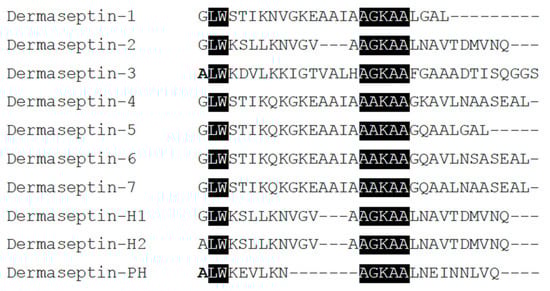 Alignments of amino acid sequences of Dermaseptin-1 (Accession No. P84596), Dermaseptin-2 (Accession No. P84597), Dermaseptin-3 (Accession No. P84598), Dermaseptin-4 (Accession No. P84599), Dermaseptin-5 (Accession No. P84600), Dermaseptin-6 (Accession No. P84601), Dermaseptin-7 (Accession No. P84880), Dermaseptin-H1 (Accession No. Q0VZ36), Dermaseptin-H2 (Accession No. Q0VZ37) and Dermaseptin-PH derived from the frog Pithecopus hypochondrialis are displayed. The identical amino acids are shaded in black; the amino acid with slight changes are indicated in bold type; the gaps are used to maximise alignments.
