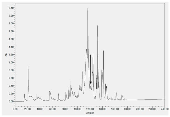 Reverse-phase high performance liquid chromatography (RP-HPLC) chromatogram of lyophilised skin secretion of Pithecopus hypochondrialis. The arrow indicates the retention time/elution position of the fraction containing a peptide with a mass coincident with that of Dermaseptin-PH. The absorbance was set at λ = 214 nm. The X-axis indicates the retention time in minutes and the Y-axis indicates the relevant absorbance in arbitrary units.