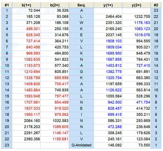 MS/MS fragmentation datasets derived from ions coincident with the mass of Dermaseptin-PH. Predicted singly and doubly charged b-ions and y-ions arising from MS/MS fragmentation of Dermaseptin-PH. Ions detected by MS/MS fragmentation are indicated in red and blue.