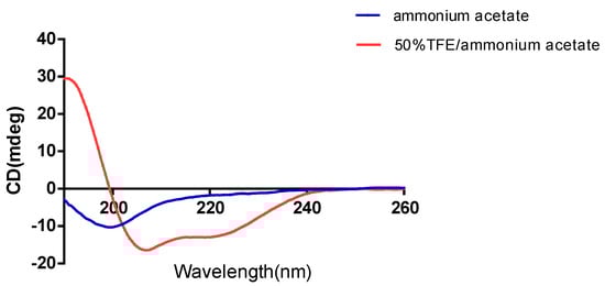 The secondary structure of Dermaseptin-PH was successfully examined by circular dichroism spectroscopy in both aqueous and membrane-mimic environment (Figure 6). Dermaseptin-PH showed a random coil conformation in ammonium acetate/water solution, while it exhibited a typical α-helical structure in 50% 2,2,2-trifluoroethanol (TFE)/10 mM ammonium acetate/water solution. The helicity of Dermaseptin-PH was calculated as 35% by DichroWeb webserver [].