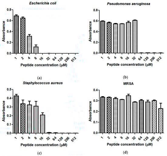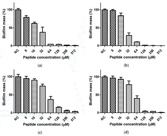Gram-negative bacterium Escherichia coli (NCTC 10418) was inoculated in Luria–Bertani (LB) broth (Sigma-Aldrich, St. Louis, MO, USA); Gram-positive bacteria Staphylococcus aureus (NCTC 10788) was inoculated in tryptic soy broth (TSB) (Sigma-Aldrich, St. Louis, MO, USA) for 16–18 h, and then subcultured until reaching the logarithmic growth phase by measuring OD of the cultures at wavelength 550 nm. For the MBIC assay, the cultures were diluted to obtain 1 × 106 cfu/mL, and incubated with various concentrations of Dermaseptin-PH with final concentration range from 1 to 512 μM in a 96 well flat-bottomed microtiter cell culture plate for 16 to 20 h at 37 °C in a shaking incubator at different revolutions per minute (rpm), according to different bacteria. After, plates were washed twice by phosphate buffered saline (PBS) and fixed with methanol for 10 min. For the MBEC assay, 100 μL of the cultures were placed in a 96 well flat-bottomed microtiter cell culture plate with a diluted colony concentration of 1 × 106 cfu/mL, and incubated at 37 °C for 16–20 h in a shaking incubator at different rpm, on the basis of different bacteria. After, plates were washed twice by PBS and incubated with 100 μL of Dermaseptin-PH dissolved in relevant culture medium, in a range of concentrations from 1 to 512 μM. Sixteen to twenty hours after exposure, plates were washed twice by PBS, and fixed with methanol for 10 min. Both MBIC and MBEC plates were stained with 150 μL 0.1% (g/v) crystal violet solutions for 30 min, and washed by PBS until no apparent stains were observed. Evaporating crystal violet stains were dissolved by 100 μL 30% (v/v) acetic acid, and the absorbance values were measured at wavelength 595 nm using a Synergy HT plate reader (Biotech, Minneapolis, MN, USA). The minimum concentration that inhibits the formation of biofilm is defined when compared to the negative control group as MBIC i.e., ≥90% (for MBIC90) and MBIC i.e., ≥50% (for MBIC50). The minimum concentration that eradicates the biofilm is defined when compared to the negative control group as MBEC i.e., ≥90% (for MBEC90) and MBEC i.e., ≥50% (for MBEC50) [].