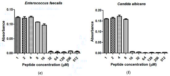 The antimicrobial activities of Dermaseptin-PH against the growth of (a) E. coli; (b) P. aeruginosa; (c) S. aureus; (d) MRSA; (e) E. faecalis; and (f) C. albicans in a range of concentrations from 1 μM to 512 μM. Data represent means ± stand error of the mean (SEM) of 5 replicates.