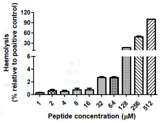 The defibrinated horse blood (TCS Biosciences Ltd., Botolph Clayton, UK) was collected, centrifuged at 1000× g for 5 min, where after, cells were washed with PBS until the supernatant was clean. The cells were resuspended with PBS to obtain a cell concentration of 4% (v/v). The pellet was incubated with Dermaseptin-PH in a range of final concentration from 1 to 512 μM at 37 °C. Two hours after exposure, supernatant was collected, centrifuged at 1000× g for 5 min, and placed into a 96 well plate. The absorbance was measured at wavelength 570 nm using a Synergy HT plate reader (Biotech, Minneapolis, MN, USA). Cells treated with 1% (v/v) Triton-X 100 for 2 h were used as positive control.