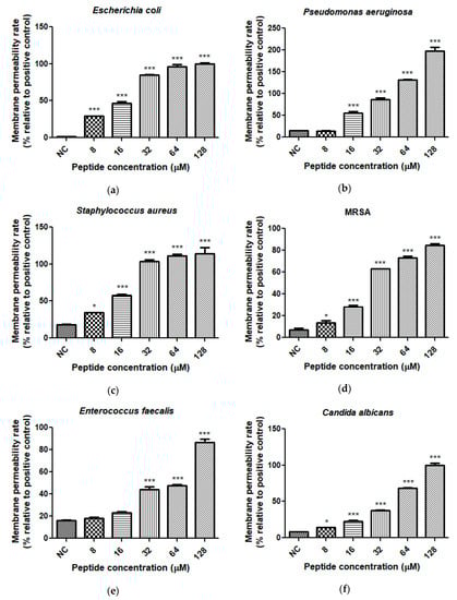 The cell membrane permeability of Dermaseptin-PH was tested in a range of concentrations from 8 μM to 128 μM (Figure 10). Dermaseptin-PH showed more effective permeable activity on E. coli, S. aureus, MRSA, and C. albicans at concentration of 8 μM. The efficient permeabilisation concentrations of Dermaseptin-PH on P. aeruginosa and E. faecalis were two times and four times higher, at 16 and 32 μM, respectively. At the MICs against the respective microorganisms, the permeability rate of Dermaseptin-PH on E. coli, P. aeruginosa, S. aureus, E. faecalis, and C. albicans was 46.4%, 131.5%, 103.6%, 44.3%, and 22.9%. And, the permeability rate of Dermaseptin-PH on E. coli, S. aureus, E. faecalis, and C. albicans was 46.4%, 110.8%, 47.8%, and 37.4% at the respective MBCs. Each assay was carried out over at least three individual experiments, with 5 replicates in each.