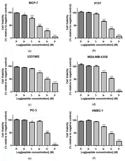 The effects of Dermaseptin-PH on proliferation of human cancer cell lines (a) MCF-7; (b) H157; (c) U251MG; (d) MDA-MB-435S; and (e) PC-3 and (f) human dermal microvascular endothelium cell HMEC-1; after treatment with Dermaseptin-PH for 24 h at a range of concentrations from 10−9 to 10−4 M. The levels of significance are: * p < 0.05, *** p < 0.001. The negative control group was treated with relevant serum-free culture medium.