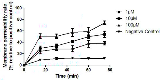 The cell membrane permeability of Dermaseptin-PH was tested in a range of concentrations after incubation with MCF-7 cells for 75 min (Figure 12). The fluorescence detected at initial stage demonstrated an immediate damage on cancer cell membrane the moment that Dermaseptin-PH was added. Each assay was carried out over at least three individual experiments, with 5 replicates in each.