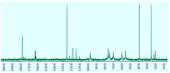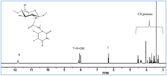 The preparation and the structure of CS-FUAC were confirmed by FTIR, 1H-NMR spectroscopy and UV-visible spectrophotometry. The CS-FUAC conjugate was prepared by the reaction of the imidazole derivative of FUAC with the extracted CS (Scheme 1). The process was started by converting 5-FU to the corresponding FUAC through an knowing method [21], treating the 5-FU with an aqueous solution of KOH and of chloroacetic acid in an oil bath at 60 °C for 6 h to yield a needle-like crystal of FUAC (0.82 g, 60% yield). The chemical structure and preparation of FUAC were proved by 1H-NMR and FT-IR Spectroscopy. The 1H-NMR spectra of FUAC (Figure S3, Supplementary Material), obviously shows the signals at δ 5.0 corresponding to the methylene of the carboxymethyl group and the signals at δ 7.4 and 8.0 ppm related to the NH and CH proton in the 5-FU ring. The FT-IR spectra of FUAC, indicates a characteristic peak at 3142 and 3062–2834 cm−1 are referring to the N–H, C–H stretching respectively. The Peaks at 1739, 1703 and 1658 cm−1 are corresponding to the C–O stretching in pyrimidine ring and COOH group respectively. The peaks due to the stretching mode of C–N, C–C, C–F and C–O appeared in a range of 1492–1179 cm−1. The FUAC-imidazole was synthesized in situ by homogeneous reaction of FUAC with imidazole in the presence of N,N-carbonyldiimidazole (CDI), then a solution of dissolved CS in aqueous acetic acid was added to the mixture in the presence of catalytic amount of triethylamine (TEA) [27]. The reaction was carried out using diverse mole ratios of CS: FUAC at the same temperature and time. The 1H-NMR spectra of CS-FUAC (Figure 2), obviously shows all the signals related to both CS and FUAC. Three signals at δ 4.3 corresponding to CH2 of the methylene group and the signals at δ 8.2 and 11.9 ppm due to the aromatic CH and NH proton of the 5-FU ring, confirm the successful coupling of 5-FUAC with CS. The chemical structure of the final compound was confirmed by 13C-NMR spectroscopy, Figure 3. Peaks at 175.02 and 23.05 ppm were found corresponding to C=O and CH3 in chitosan, respectively. Peaks at 26.25, 40.10 and 126.20 ppm were found due to the presence of carbon atoms in the FUAC moiety. The FT-IR spectrum of CS-FUAC conjugates (Figure 4) illustrated the characteristic peaks of both CS and FUAC. The FT-IR spectra of FUAC showed peaks at 3142 and 3062–2834 cm−1, corresponding to the N–H and C–H stretching respectively. Peaks related to C–O stretching of COOH group and C–O stretching in pyrimidine have appeared at 1660, 1741 and 1705 cm−1 respectively. The peaks between 1498–1182 cm−1 is corresponding to the C–N, C–C, C–F and C–O stretching mode respectively. The presence of a new peak at 1700 cm−1 confirms the formation of an amide bond between FUAC and CS. The chemical structures of CS, FUAC and CS-FUAC conjugates were proved by UV-vis spectroscopy Figure 5. As shown from the spectrum of CS-FUAC conjugate, a broad absorption band at 273 nm which indicates the presence of 5-FU in the conjugate. The characteristic absorption peak at 273 is due to the π → π* energy level transition of FUAC.