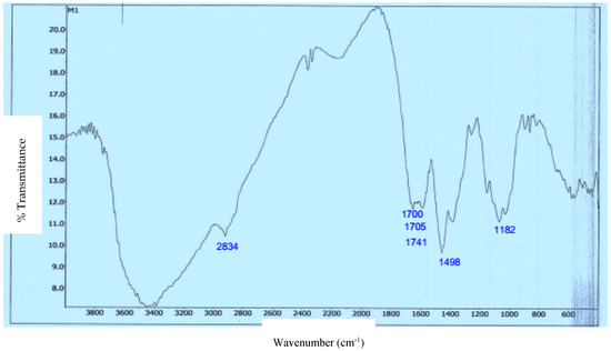 The schematic diagram for extraction of CS from fish scales is shown in (Figure S1, Supplementary Material). The FT-IR spectrum of the extracted CS (Figure S2, Supplementary Material) shows different stretching vibration bands as characteristic peaks in the range 3424–2883 cm−1 associated to ν (N–H) in ν (NH2) assoc. in amines [26]. The band range at 3424–3421 cm−1 may be related to ν (O–H), ν (N–H) and ν (NH2). The spectral bands between 1465–1040 cm−1 correspond to the stretching and bending vibrations of C–O, C–C and C–OH. Stretching vibration bands corresponding to the methyl group in NHCOCH3, methylene group in pyranose ring and a methylene group in CH2OH was showed in the range 2921–2879 cm−1. The effective of deacetylation was proved by which the band at 1597 cm−1 has a great intensity than at 1655 cm−1. The bands in the range 1605–1565 cm−1 corresponding to the primary amine groups, when the absorption bands at 3450, 3262, 3114 and 1658 cm−1 due to amide groups are missing from the deacetylated chitin and the absorption at 1590 cm−1 related to NH2 deformation of primary amines appears. The β-glucosidic linkages between the sugar units appeared as a sharp peak at 880 cm−1. An absorption band was observed in the range of 300–400 nm in the UV spectrum of CS at room temperature with 1 nm resolution as shown in Figure 3. The wavelength of CS was found to be 340 nm. This band absorption is related to the direct electronic d-π* orbitals and is called the Soret band.