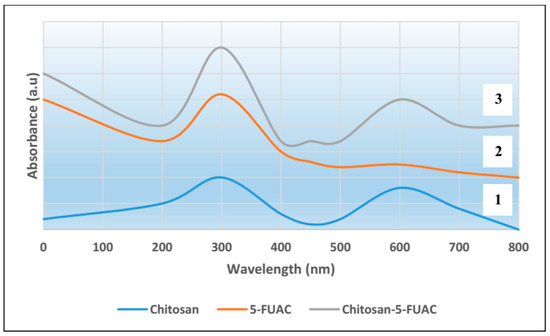 UV-vis spectra showing chitosan (CS) spectrum ‘1’, 1-acetic acid-5-fluorouracil (FUAC) spectrum ‘2’ and CS-FUAC conjugate spectrum ‘3’.