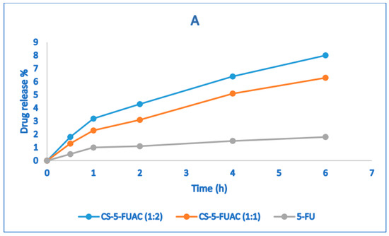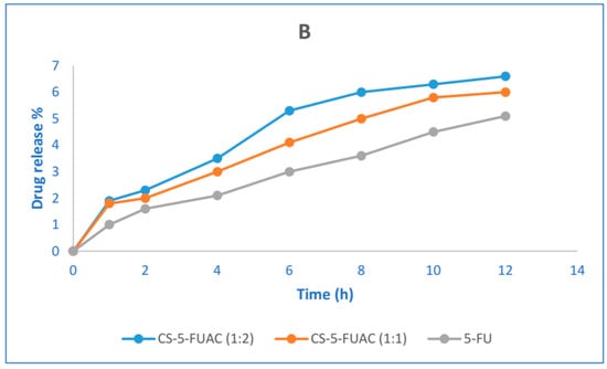 The prodrug which targets the colon specifically should be stable at a wide range of pH during passing through the alimentary canal. In order to investigate the performance of the prepared prodrug in both acidic and basic conditions, two buffers of pH 1.2 and 7.4 were used to study the stability of the conjugate. Although the transition time is about 2 h in the stomach, the stability in pH 1.2 was carried out for 6 h (Figure 6A). Correspondingly, the stability of pH 7.4 was done for 12 h (Figure 6B), in spite of the fact that the transition time for small intestine is about 4 h. The result of the release patterns of the conjugates showed that just 3–5% release in acidic buffer was observed, while in the basic buffer it was 3–4%. The drug release in acidic conditions is higher when compared to the basic case and this may be because the acidic media works as a catalyst for the hydrolysis of an amide bond. The drug release of CS-FUAC is almost higher than the free drug 5-FU. In order to study the half-life of the conjugate, UV spectra of the aqueous solutions of the sodium salts of the CS-FUAC and FUAC were carried out and their λmax were recorded. Since plotting log concentration against time resulted in a straight line and from the slope of this plot, the observed rate constant of hydrolysis was calculated, hydrolysis of the conjugate follows the pseudo-first order kinetic. The degree hydrolysis of the conjugate were carried out at different time intervals (0, 15, 30, 60, 120 and 240 min); solution of (20 μg/mL) from the conjugate was taken in phosphate buffer (0.2 M, pH 7.4) and KCl/HCl buffer (0.2M, pH 1.2), incubated at 37 °C for 240 min. The half-life values were calculated from the pseudo-first order kinetic law. The result showed that the conjugated compound has a t1/2 3.48 in acidic media while t1/2 15.26 in basic condition. Therefore, the above result has indicated significant increase in the values of t1/2 of CS-FUAC in comparison with FUAC at both acidic and slightly basic media pH 1.2 and pH 7.4 respectively [28].