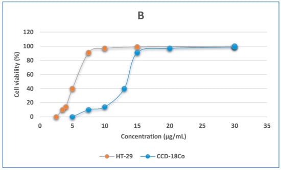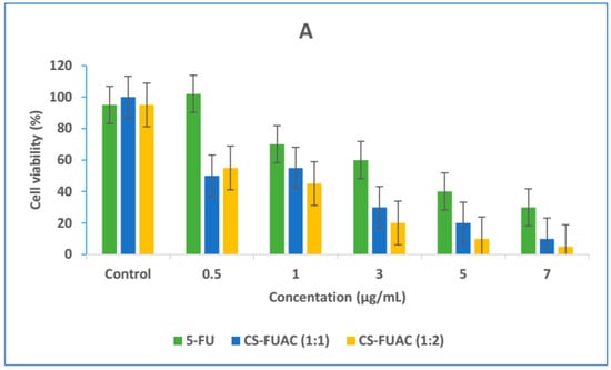 MTT viability assay of HT-29 cells treated with (0.5–7 μg/mL) of 5-FU and CS-FUAC conjugates, for 24 h (A); Dose response curves of the CS-5-FUAC on HT-29 and CCD-18Co cells in the concentration range 2.5–30 μg/mL (B). All values are expressed as mean ± SD (n = 3).